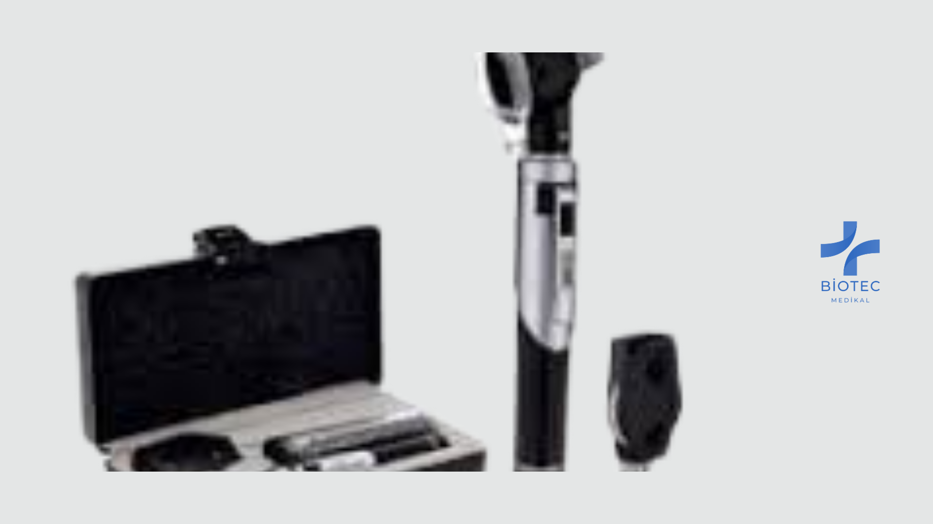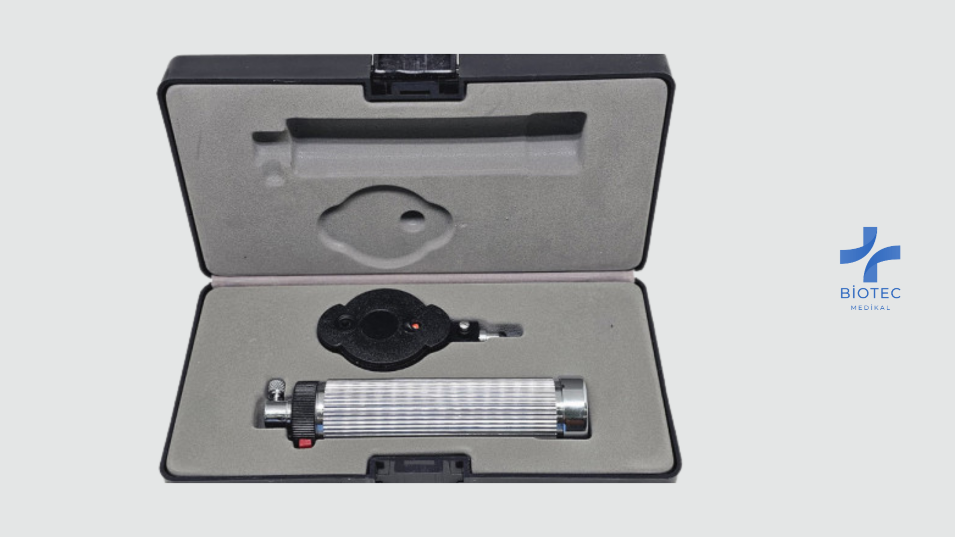 Metal kasasıyla uzun ömürlü, retina ve göz dibi muayeneleri için yüksek ışık kalitesi sunan oftalmoskop.