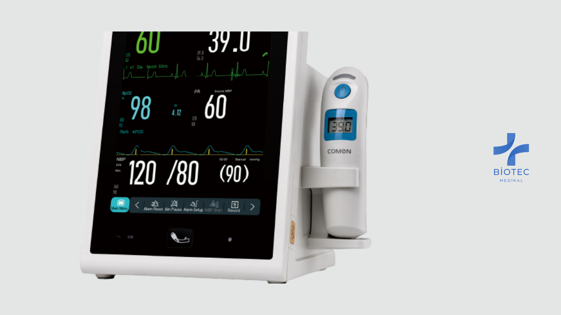 COMEN NC5, yoğun servisler, poliklinikler ve hasta nakil süreçlerinde kullanılmak üzere tasarlanmış çok parametreli bir vital monitör çözümüdür. 8 inç renkli dokunmatik ekranı, entegre NIBP, SpO₂ ve nabız ölçümleriyle birlikte; isteğe bağlı olarak 3‑kanallı EKG, kulak tipi kızılötesi sıcaklık sensörü ve termal yazıcı gibi modülleri destekler.